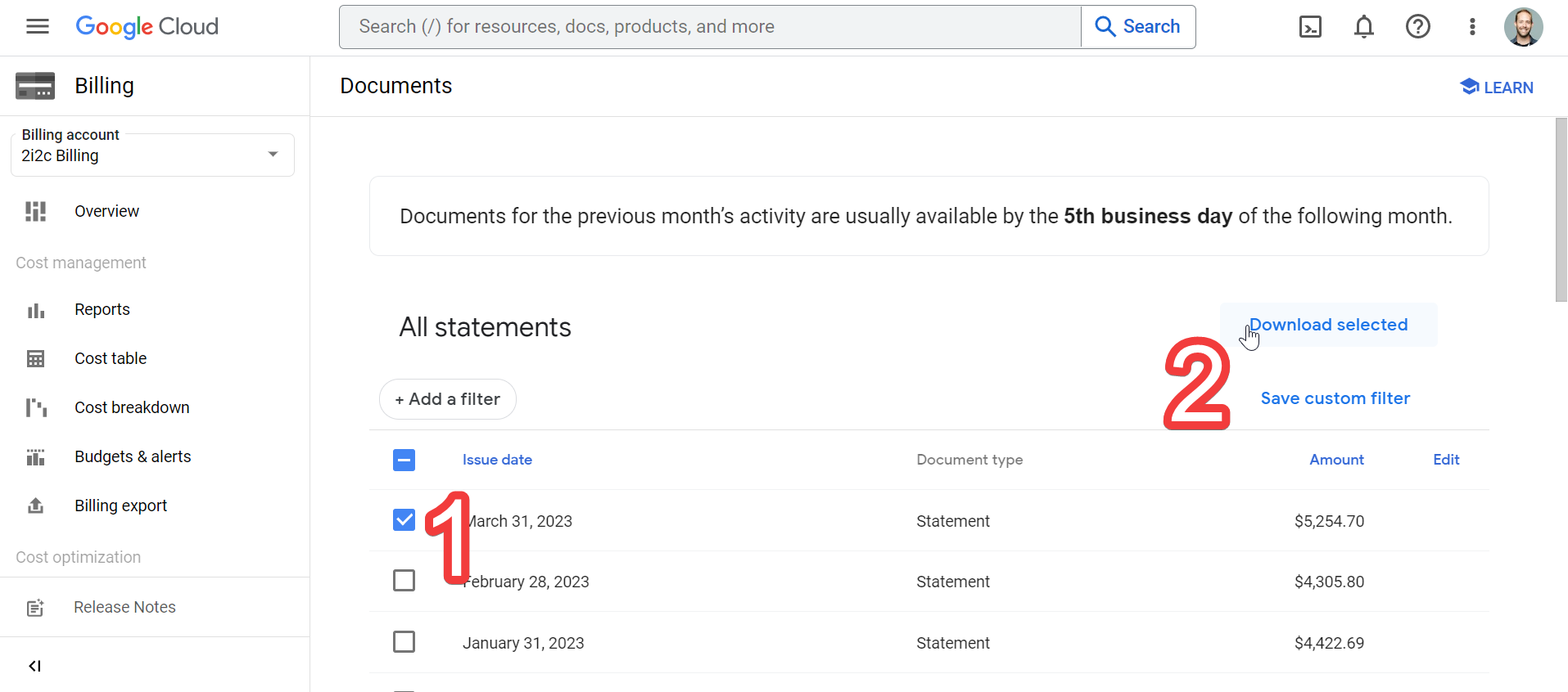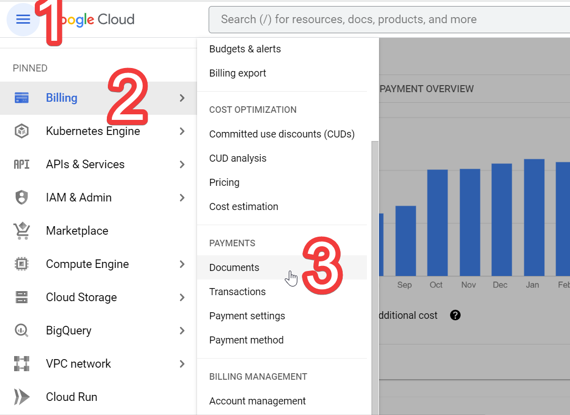 Use the Google Cloud Console UI to find invoices for previous months. In GCP “invoices” are called “statements”. To find a statement for a month, follow these steps: